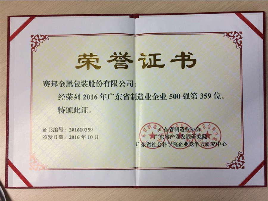 為推動落實“中國智造2025”的國家戰略方針“2016年廣東省制造業企業500強”排序工作由廣東省制造業協會與廣東省社會科學院企業研究所聯合在全省范圍內開展,經過企業申報、公開數據采集和深入調查、核實等多渠道進行了信息采集,并按照入圍條件和參照國際上通行的評價準則,經專家委員會嚴格審定。賽邦金屬包裝股份有限公司是廣東金屬包裝行業龍頭企業,近幾年在技術工藝提升,產品結構升級等方面取得重大突破,企業獲得迅速發展。